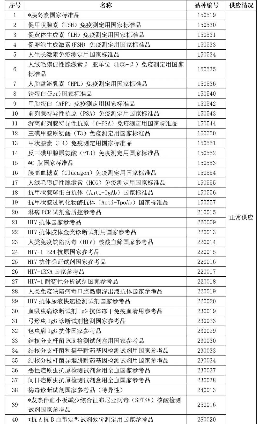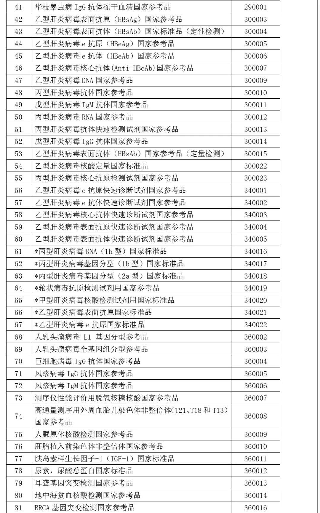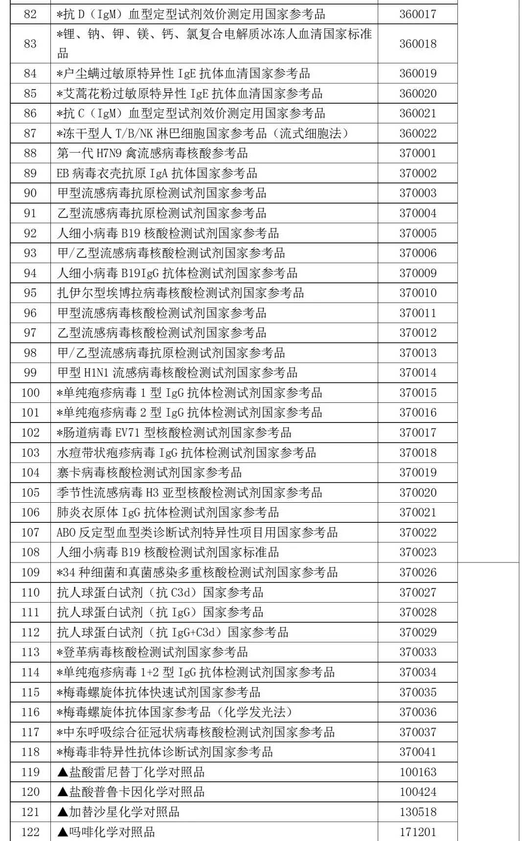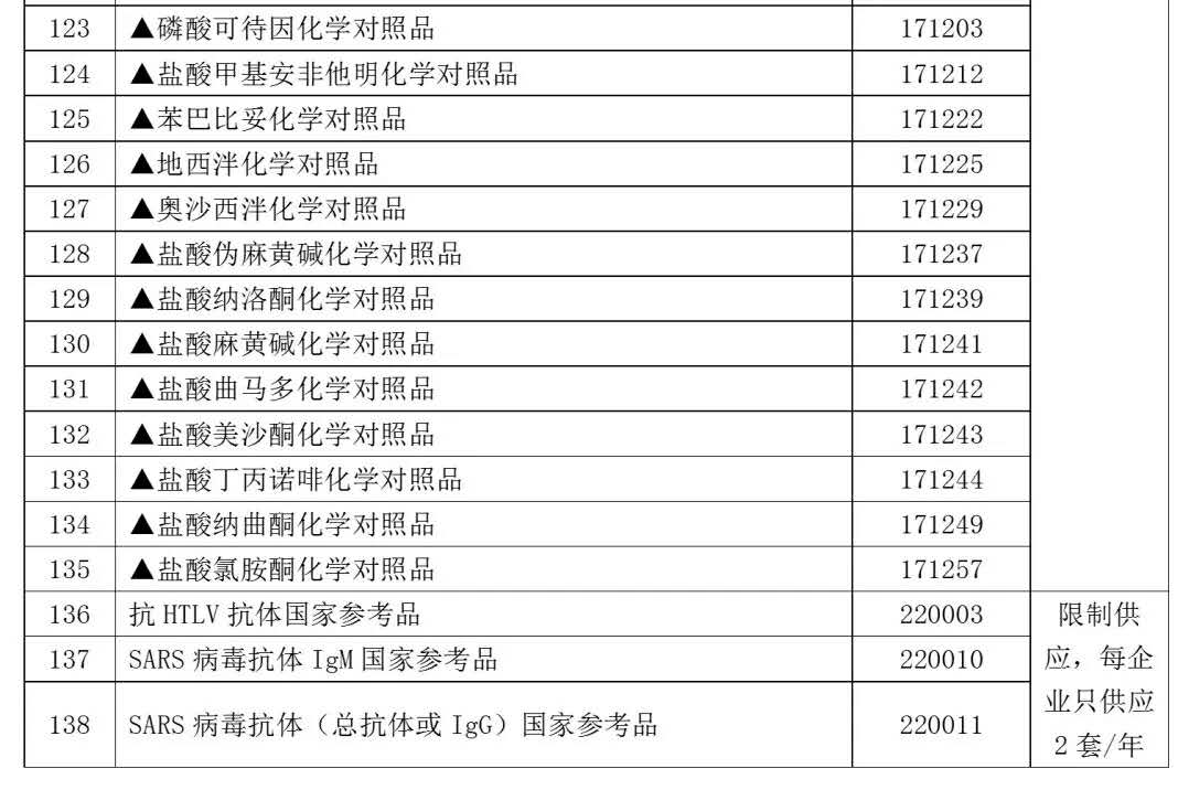 1. *標(biāo)識品種為本期目錄新增體外診斷試劑標(biāo)準(zhǔn)物質(zhì)。 2. ▲標(biāo)識品種為可用于體外診斷試劑檢驗(yàn)的化學(xué)對照品。 3. 限制供應(yīng)是指僅供給相關(guān)體外診斷試劑生產(chǎn)企業(yè)。