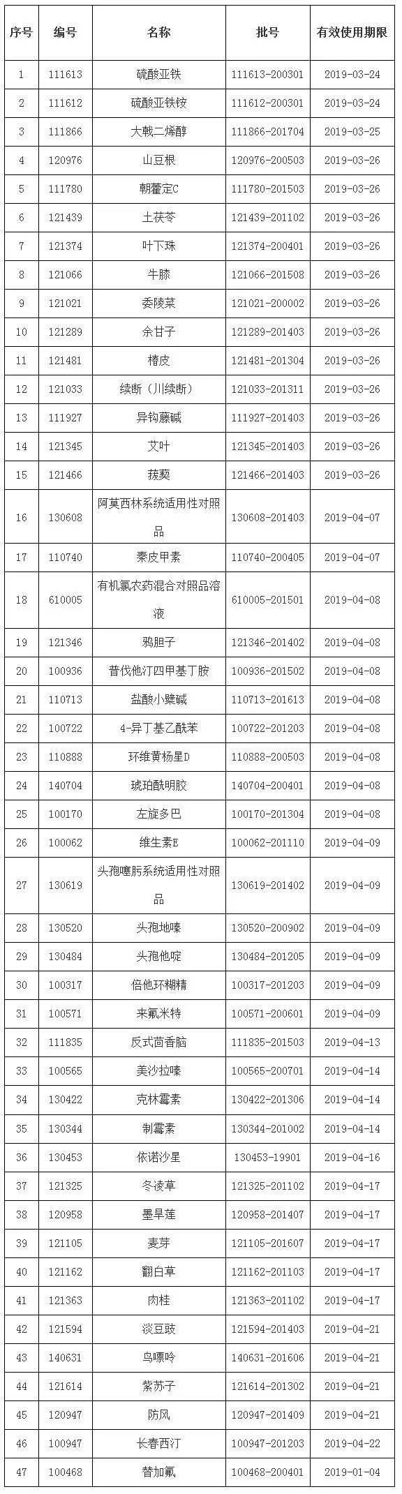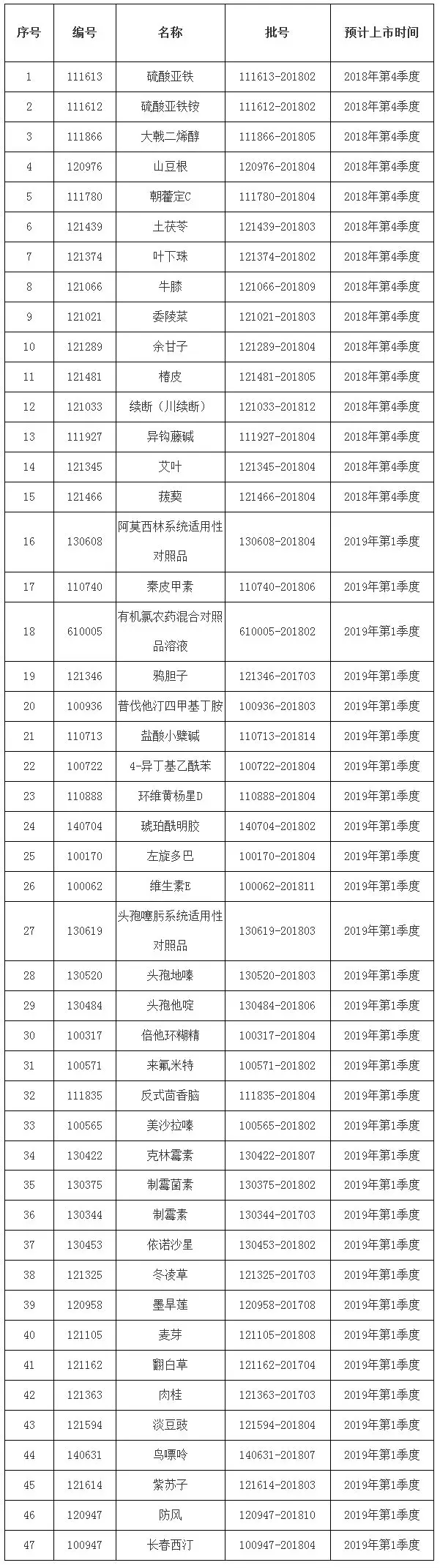 ? ? 2018年第十一期國家藥品標(biāo)準(zhǔn)物質(zhì)供應(yīng)新情況,包括47個即將換批品種的預(yù)計上市時間、47個即將失效品種的有效使用期限和2個停用品種名單。